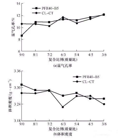 ▲图5 复合氧化铝微粉种类及其复合比例对烘干后试样显气孔率和体积密度的影响