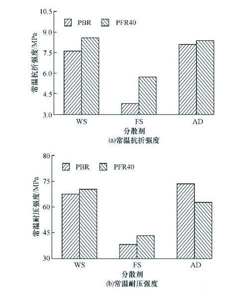 ▲图3 加入氧化铝微粉PBR或PFR40的浇注料的常温抗折强度和常温耐压强度随分散剂种类和加入量的变化