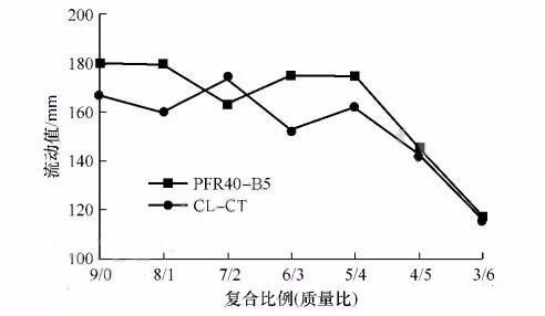 ▲图4 复合氧化铝微粉种类及其复合比例对浇注料流动值的影响