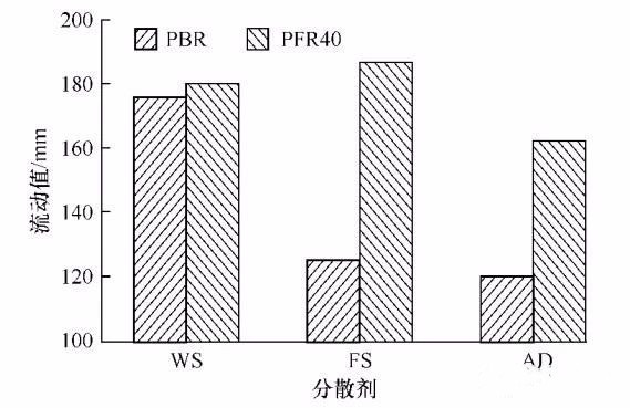 ▲图1 加入氧化铝微粉PBR或PFR40的浇注料的流动值随分散剂种类和加入量的变化