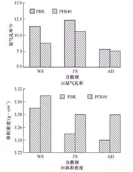 ▲图2加入氧化铝微粉PBR或PFR40的浇注料的显气孔率和体积密度随分散剂种类和加入量的变化